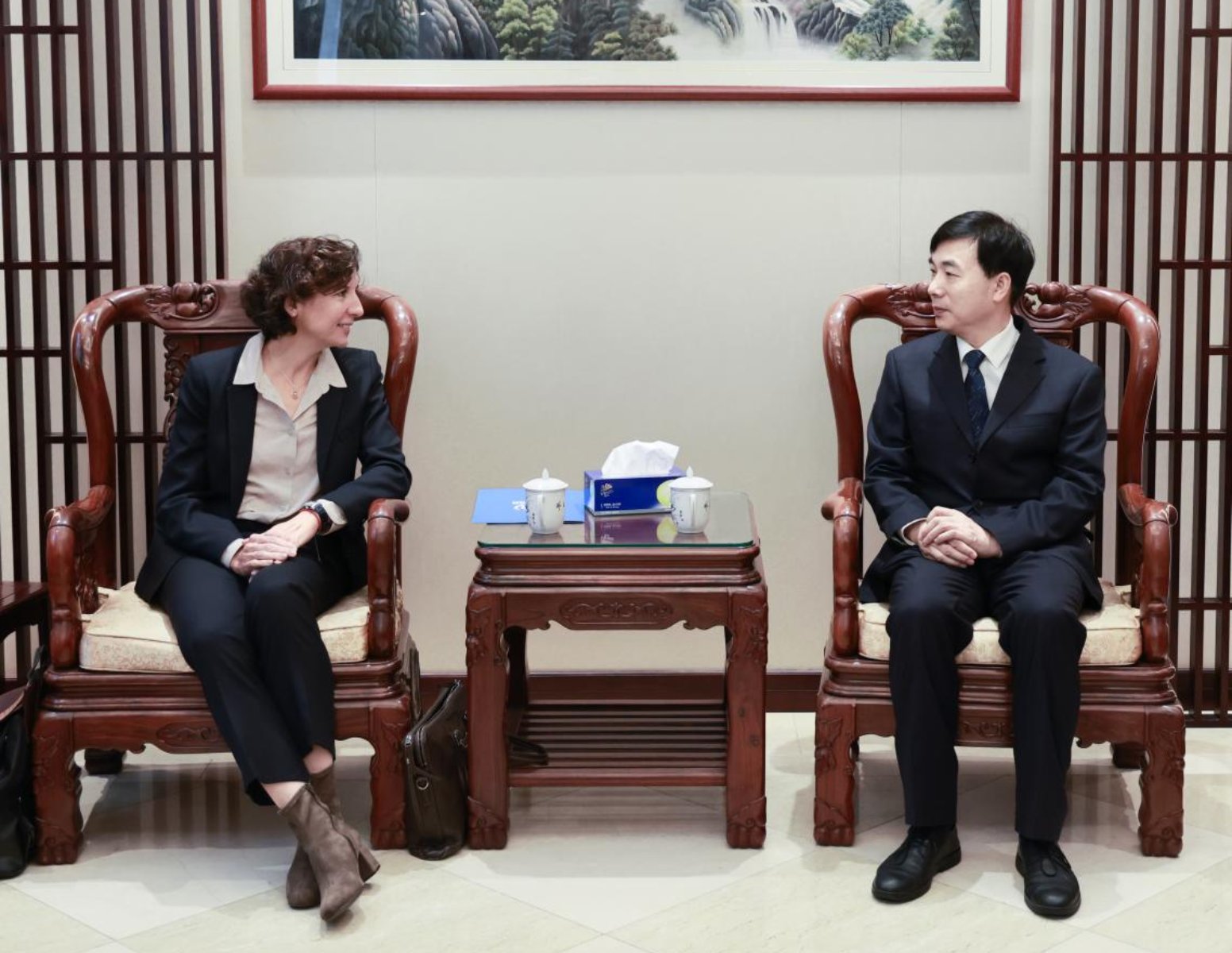 2025年10月9日,王帆院长会见联合国难民事务高级专员公署(以下简称“联合国难民署”)驻华代表穆索菲(Sophie Muller)一行。外事办公室主任马新宇等陪同会见。