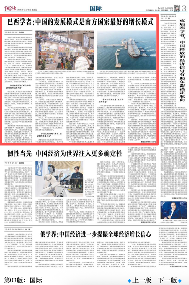 在解读2025年政府工作报告时,弗雷塔斯教授指出,面对全球挑战,中国经济展现出强大韧性,通过创新驱动和扩大内需,坚持高水平对外开放与多边合作,为全球治理提供稳定力量。