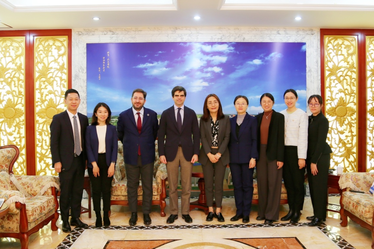 孙副院长对代表团来访表示欢迎,介绍了学院办学特色及优势、人才培养目标和国际交流合作项目。本朱梅亚先生和穆尼斯教务长表示十分重视两校合作,介绍了IE大学相关情况以及与国家留学基金管理委员会在国际组织后备人才培养方面的合作。双方一致认为两校专业设置契合度高、合作前景广阔,在本硕层面联合授予学位、学生长短期访问互换、联合举办学术会议、互派访问学者、合作开展模拟联合国活动等方面达成初步共识。